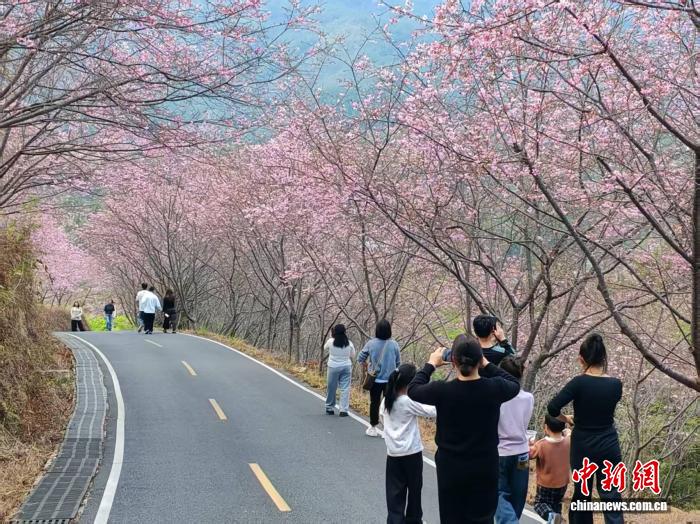 中新网福建清流2月24日电 (雷朝良)马年新春,福建省三明市清流县赖坊镇的山间花海如潮。两千亩樱花圃迎来盛花期,三十万株樱花按序怒放,粉白相间、漫山如云,眩惑各地搭客踏春而来,也让这片由台胞深耕多年的地皮,在年味中更添融融乡情。