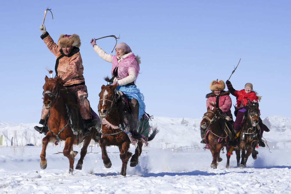 在新疆青河县狼山景区跑马场,当地各人参与随即通达“小姐追”欢度新春佳节(2月17日摄)。新华社发(叶尔江·木哈买提 摄)