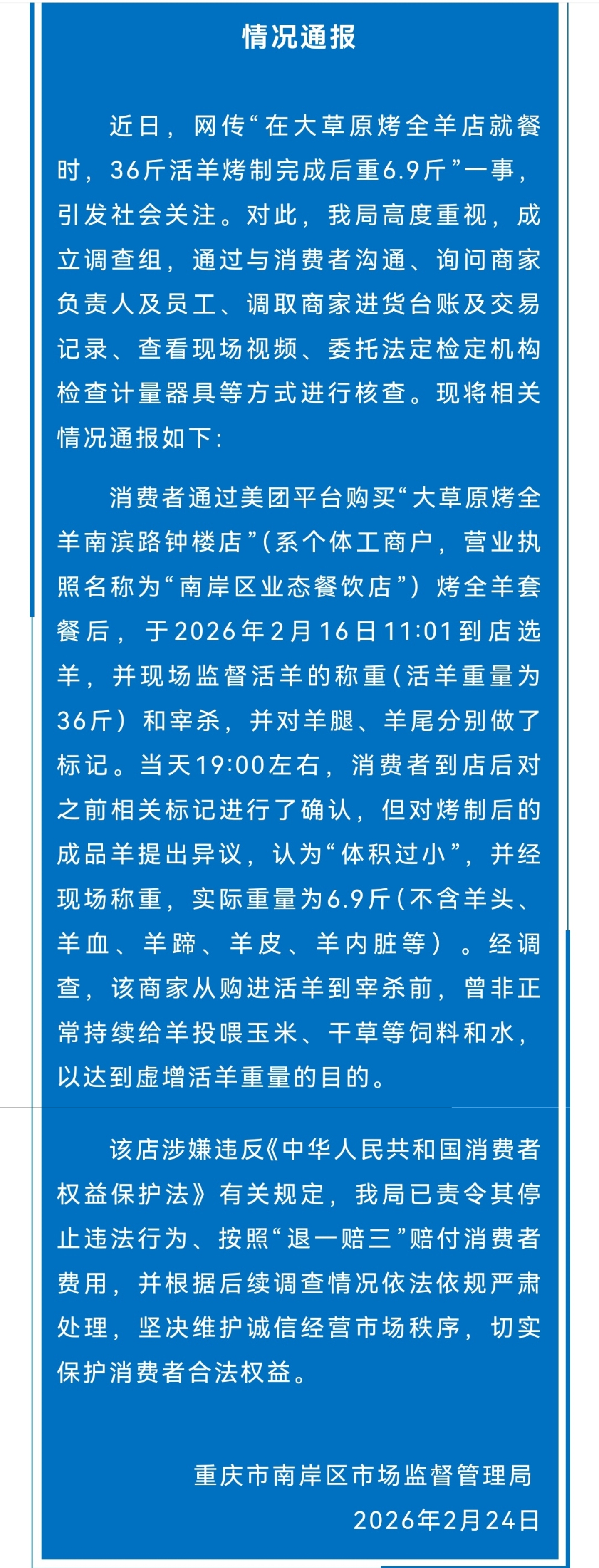 2月24日,重庆市南岸区阛阓监督科罚局就网传“在大草原烤全羊店就餐时,36斤活羊烤制完成后重6.9斤”一事发布情况通报。