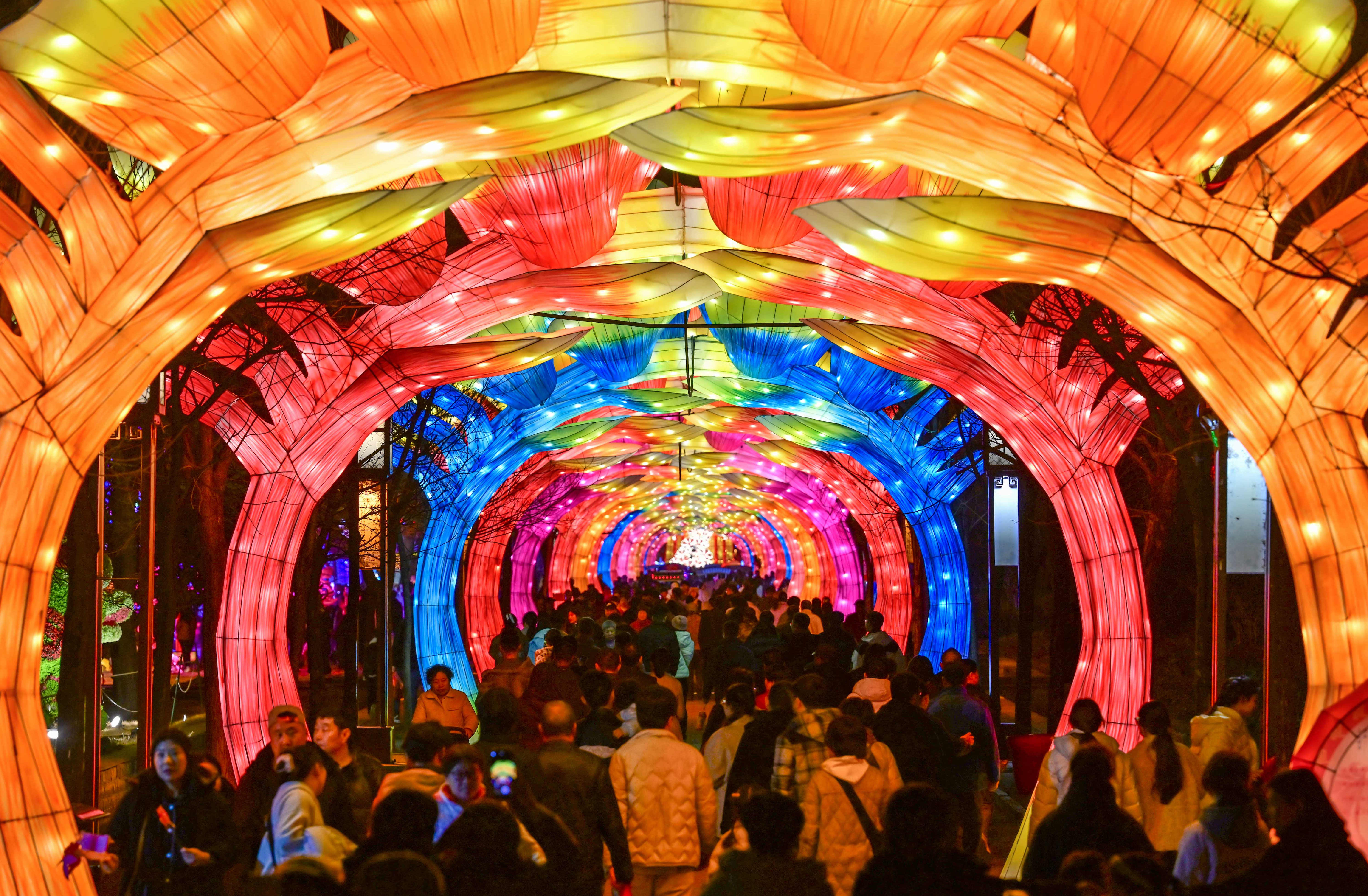 2月19日,旅客在河南省洛阳市隋唐城名胜植物园抚玩“神齐上元灯会”主题特质灯展。新华社发(李卫超 摄)