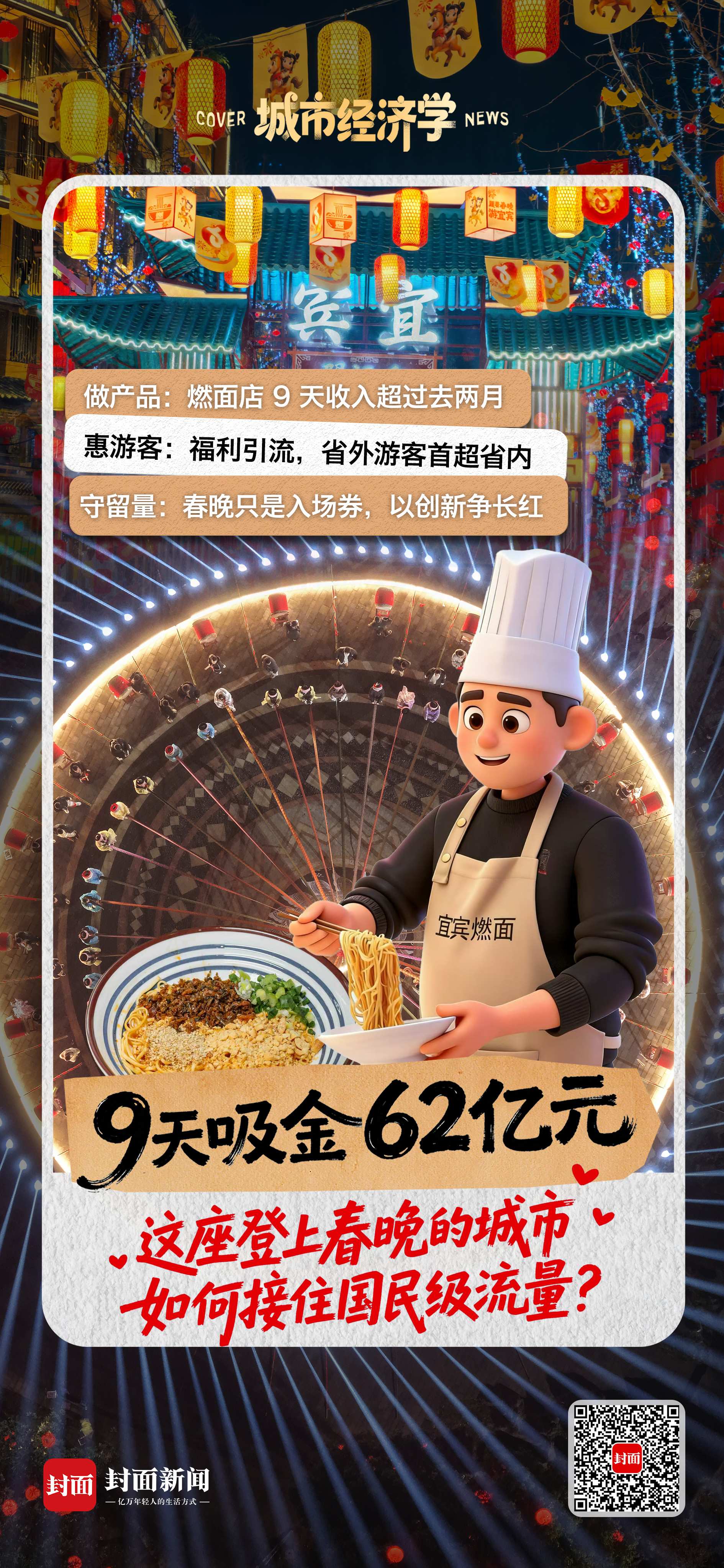 一碗春晚同款燃面,成为外地旅客的宜宾第一站。在冠英古街的“燃面探究所”里,厨师正甩干一份份红油飘香、豆芽脆嫩的燃面。“2月15日至23日,咱们一共卖出了1.6万份干拌面,2600多份汤面,收入约24万元,9天卖了浮浅近2个月的收入额。”店长于体裁员人的账本里,是春晚流量最鲜美的注脚。
