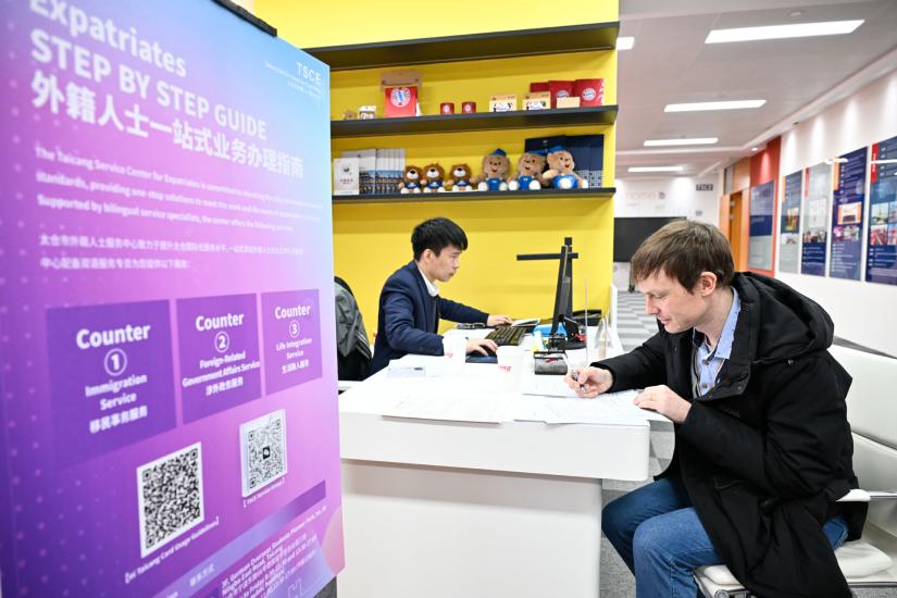 2月25日,在太仓市外籍东说念主士劳动中心,别称德企职工在办理业务。(图片泉源:新华社)