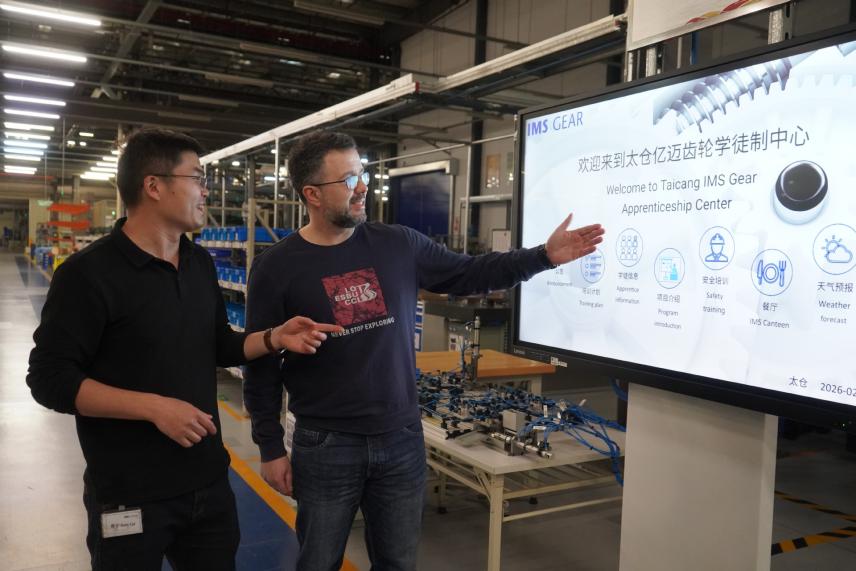 2026年2月24日,培训师托马斯(右)在亿迈齿轮(太仓)有限公司西宾双元制培训。(图片泉源:新华社)