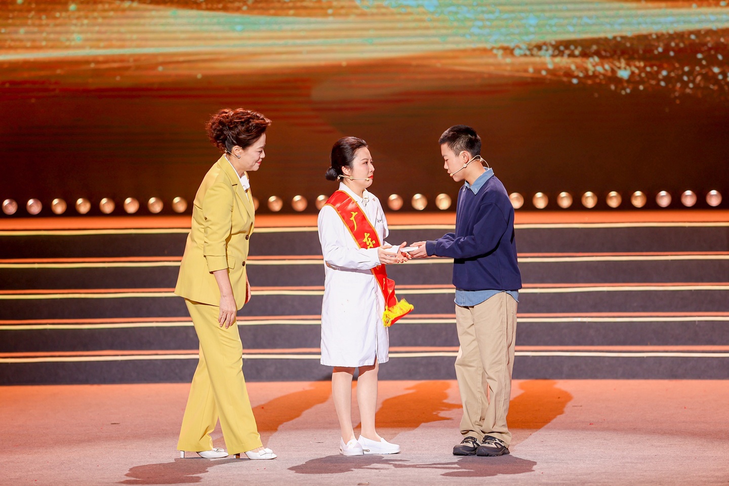 聚光灯下,一个男孩略显弥留地走上舞台,将一份礼物递给我方的母亲——韶关督察李梦旖。
